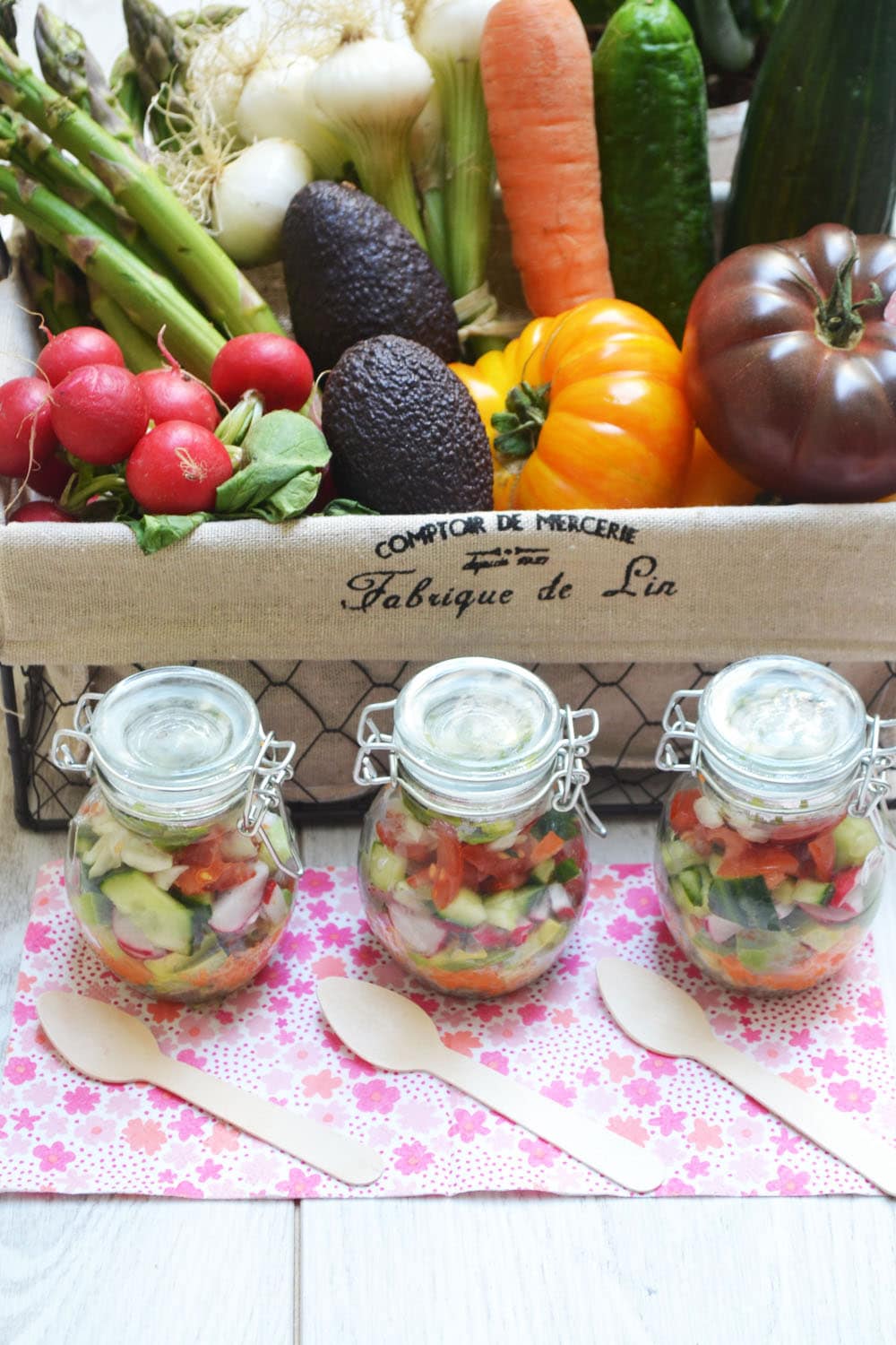 - Dans chaque bocal, répartir la purée d’avocat, les rondelles de radis et les cubes de concombre et de tomates. Parsemer d’oignons nouveaux et de têtes d’asperges.