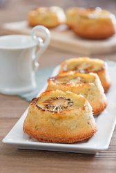 Laisser tiédir avant de démouler les petits moelleux et de les servir retournés (la tranche de kiwi visible).