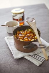 - Laver, peler et tailler les navets en dés réguliers. Dans une sauteuse antiadhésive, déposer les navets. Ajouter le beurre, le miel et couvrir à mi hauteur de jus de carotte. Cuire environ 7 à 8 minutes.