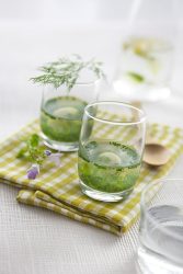 - Laver, sécher et ciseler les herbes. Dans une casserole verser l'eau et porter à ébullition. Y plonger les herbes. Laisser infuser à feu doux. Presser la gélatine dans les mains puis la déposer dans la casserole pour la faire fondre. Laisser tiédir puis verser dans chaque verrine (de façon à couvrir entièrement l'œuf). Laisser refroidir puis placer au frais pour 2 heures de prise au froid.