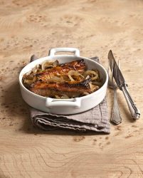 - Tapissez un plat avec les oignons confits au cidre et déposez dessus les travers badigeonnés.