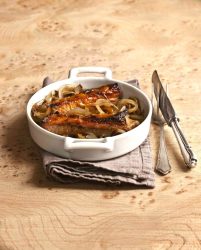 Oignons confits au cidre et travers de porc au miel