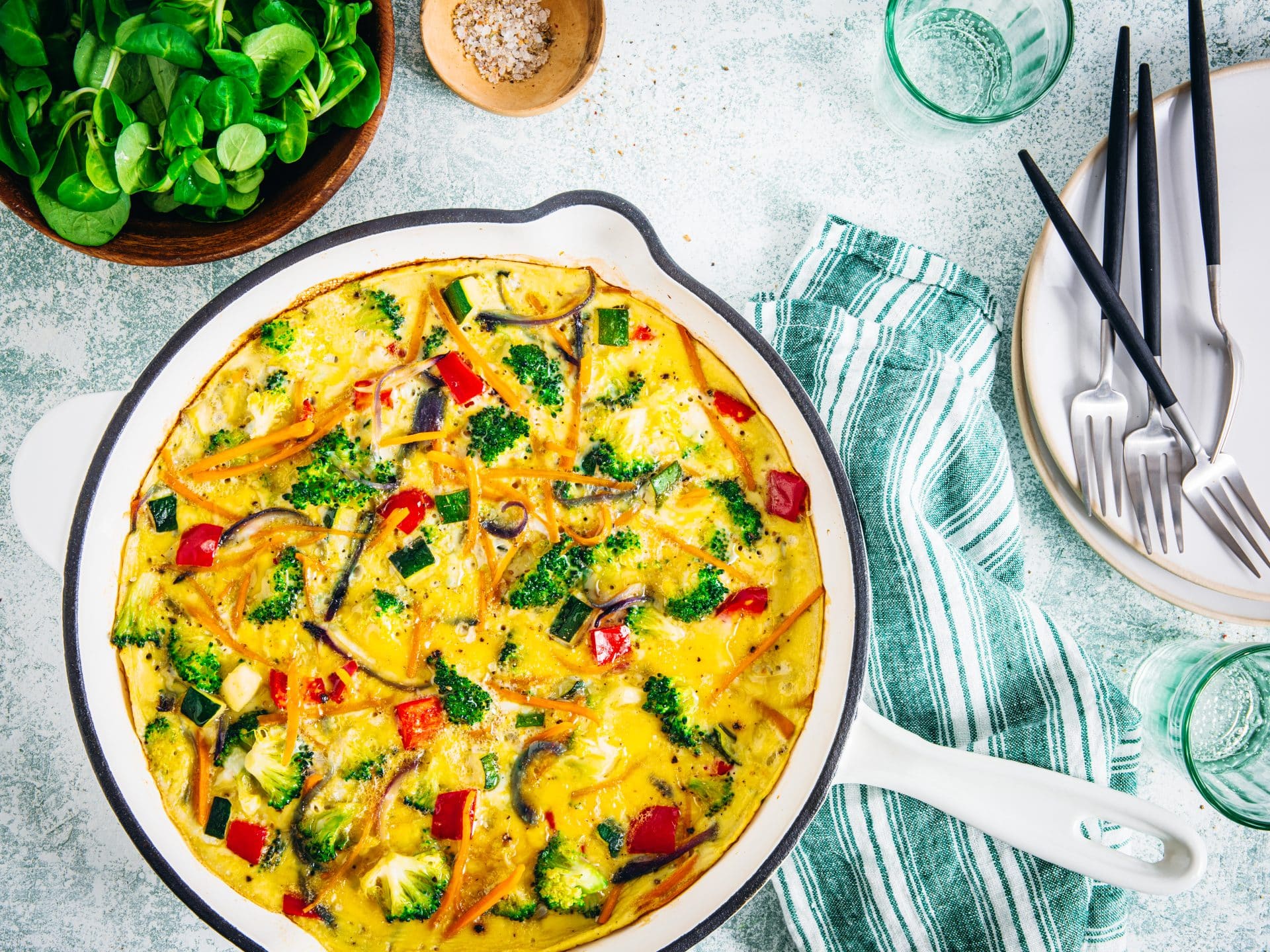 Versez ensuite les œufs battus sur les légumes. Réduisez le feu à moyen-doux et laissez cuire l’omelette pendant environ 5 minutes. Servez avec une salade verte.