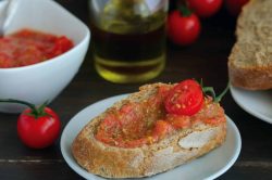 - Frotter la chair de chaque demi-tomate sur les tranches de pain. Jeter la peau.
