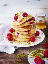 Servez les pancakes avec une cuillère de yaourt, des framboises fraîches, des pistaches concassées et un filet de miel.