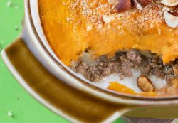- Dans le fond d’un plat à gratin légèrement beurré, étaler la préparation boeuf/oignons et recouvri de purée. Saupoudrer de chapelure et de noisettes concassées.
