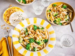- Portez à ébullition une grande casserole d’eau salée. Faites-y cuire les penne selon le temps indiqué sur le paquet, en ajoutant les fleurettes de brocoli pour les 5 dernières minutes de cuisson, puis égouttez en gardant 1 louche d’eau de cuisson.