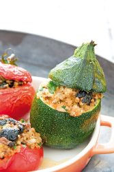 - Garnir les tomates, les demi-courgettes et les quarts de poivron de cette préparation. Enfourner les légumes farcis dans un plat à gratin pour 35 min de cuisson.
