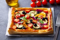 - Répartissez harmonieusement les rondelles de courgette et les tomates hachées sur la pizza.