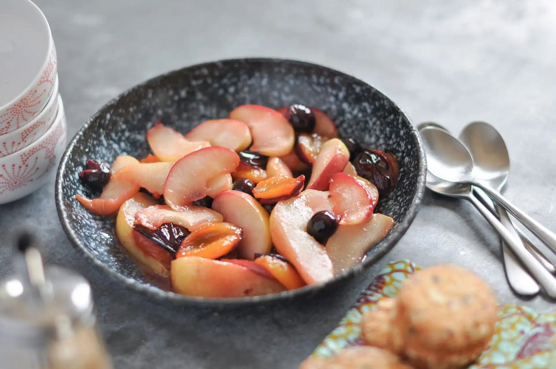 Variantes de saison : abricot, nectarine, ananas, mangue…cette poêlée simplissime et délicieuse est réalisable avec presque tous les fruits !