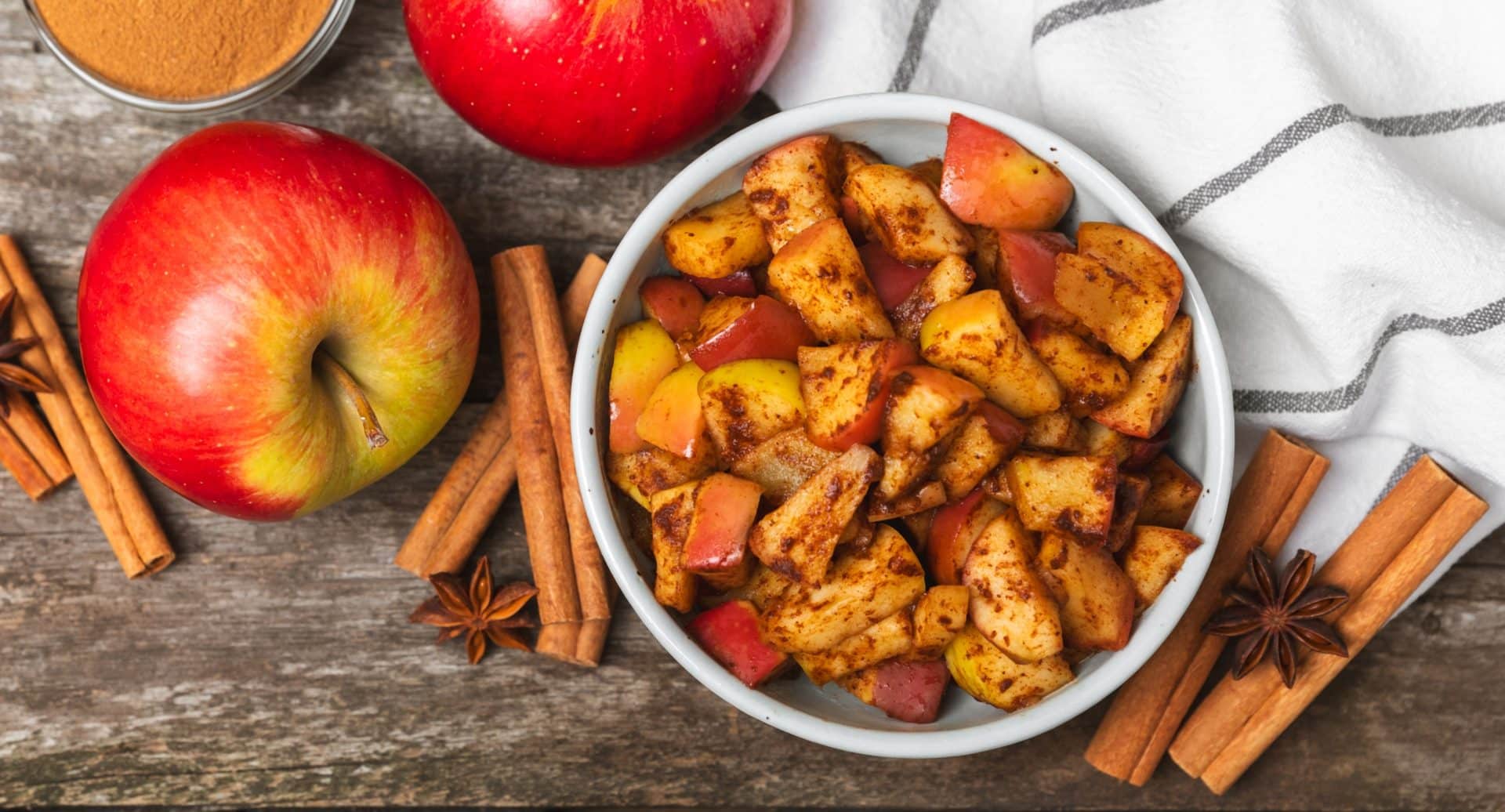 - Servir les pommes dans des verrines ou sur assiette et les parsemer de poudre de spéculoos. Servir chaud ou tiède.