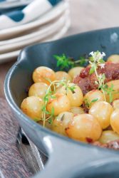 Ajouter les grains de raisin et les faire chauffer en remuant régulièrement pour qu’ils soient enrobés de sauce. Parfumer de thym. Servir le canard avec le raisin.