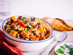 Épluchez et coupez les patates douces en cubes. Lavez le poivron, enlevez ses pépins et coupez-le en lanières. Lavez les champignons et coupez-les en deux. Épluchez et découpez l’oignon et les gousses d’ail.