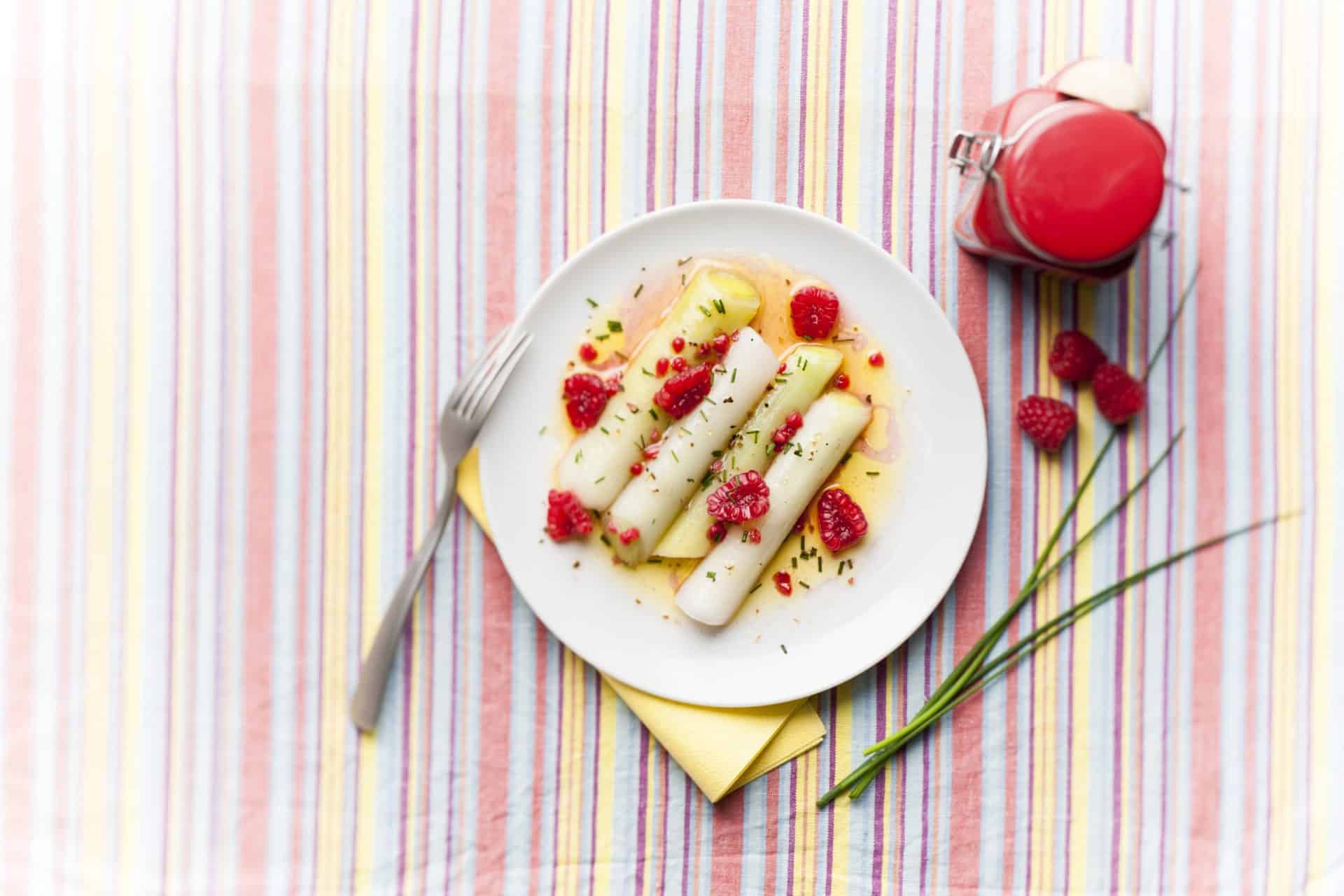 - Découper les framboises restantes en deux et les déposer délicatement sur les poireaux.