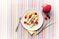Découper les framboises restantes en deux et les déposer délicatement sur les poireaux.