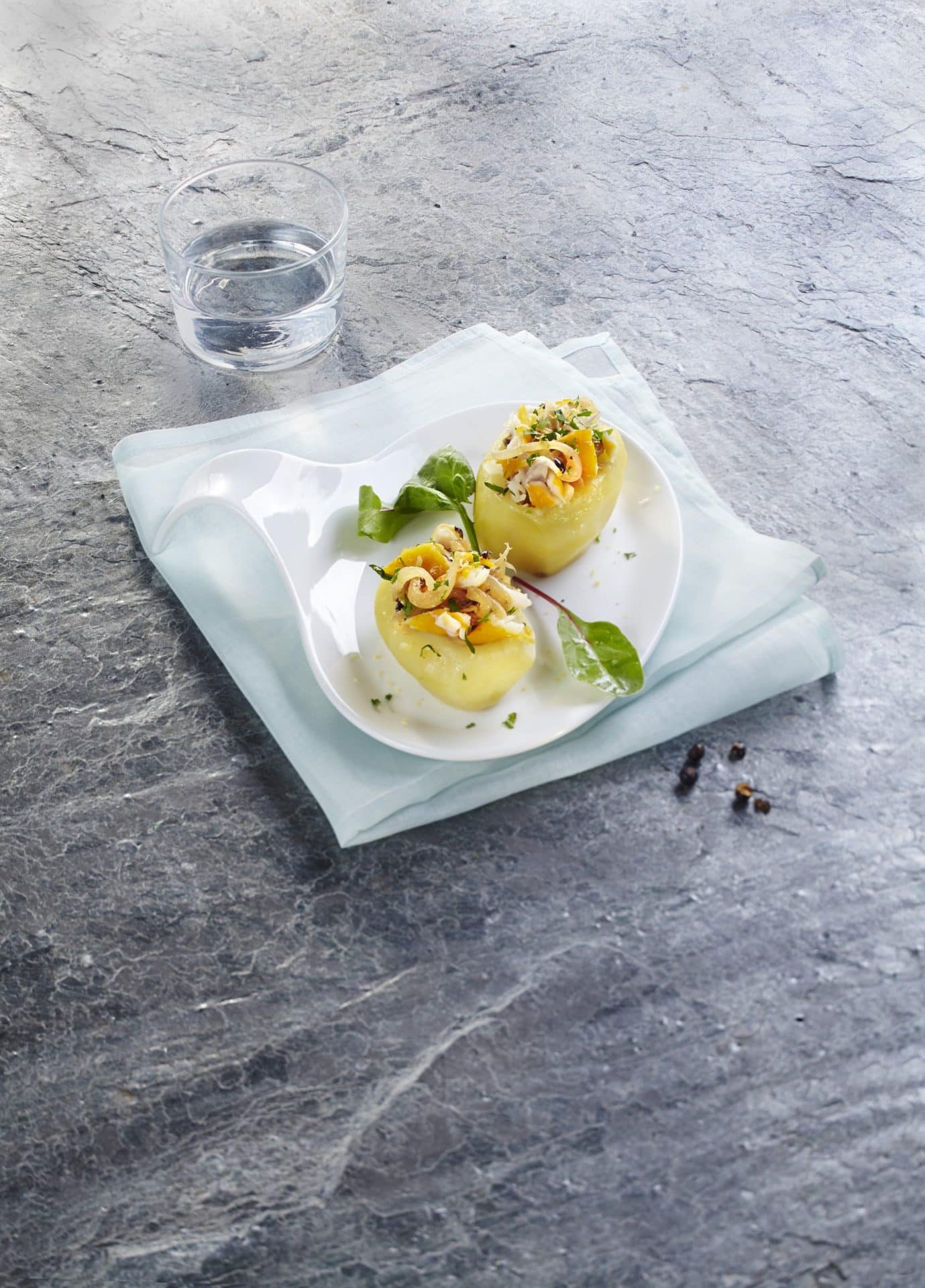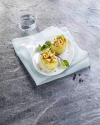 - Faites pocher votre morceau de haddock dans du lait : dans une casserole, plongez le haddock dans le lait et faites-le cuire 10 à 15 min « à frémissement » (sans atteindre l’ébullition). Garnissez le creux des pommes de terre de fondue d’oignon. Posez dessus un peu de haddock fumé (détaillé en pétales). Parfumez de quelques gouttes et de zestes de citron. Parsemer de persil plat haché.