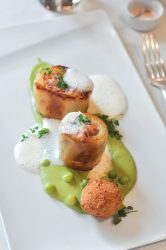 Pommes de terre confites au beurre, pieds de cochon, crème de petits pois au basilic et cromesquis