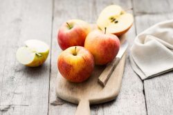 - Couper aux ¾ deux pommes et les évider en allant jusqu'au péricarpe (l'enveloppe protectrice des graines). Les cuire au four 8 à 10 minutes à 150°C arrosées d'un peu d'huile d'olive. Saler, poivrer.