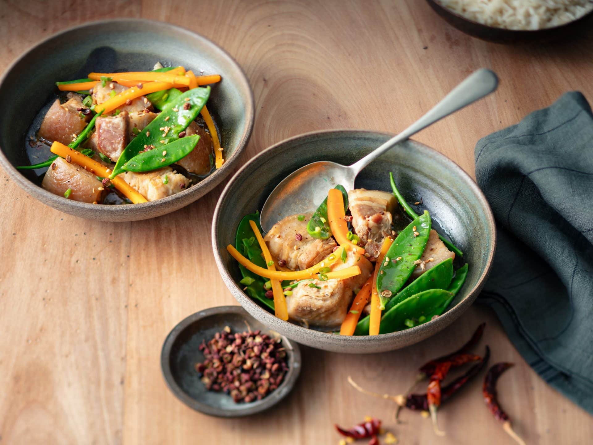 - Dans un wok, chauffer l’huile puis faire revenir le piment et l’anis étoilé 1 minute, ajouter le porc coupé en morceaux, le gingembre et une pincée de sel.