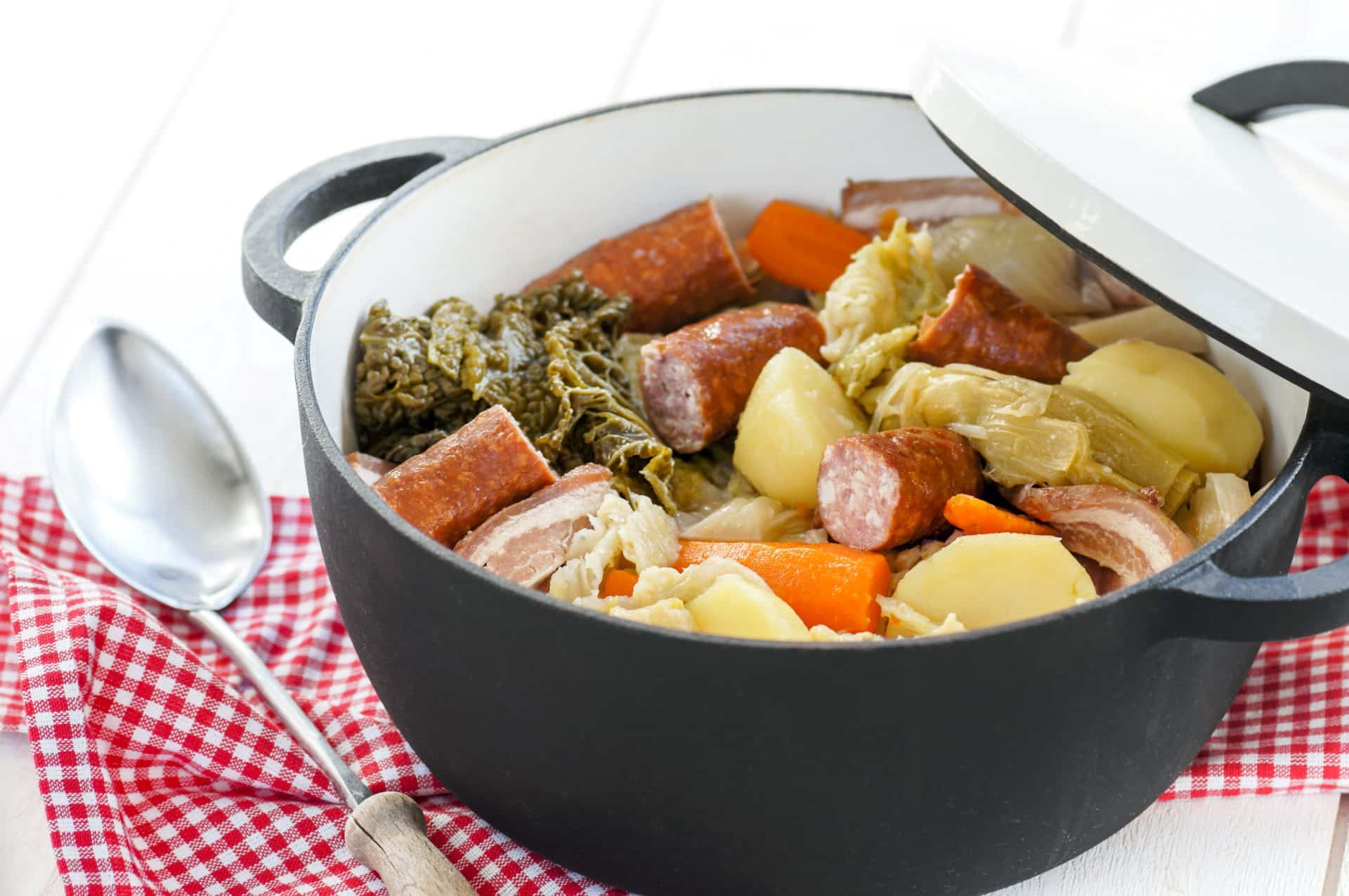 Verser 75 cl à 1 l d’eau. Ajouter le cube de bouillon, le bouquet garni, les carottes, les pommes de terre juste coupées en deux, les morceaux de chou vert et terminer par les saucisses. Couvrir et laisser mitonner à feu moyen pendant environ 40 min.
