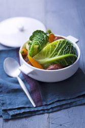 - Verser 75 cl à 1 l d’eau. Ajouter le cube de bouillon, le bouquet garni, les carottes, les pommes de terre juste coupées en deux, les morceaux de chou vert et terminer par les saucisses. Couvrir et laisser mitonner à feu moyen pendant environ 40 min.