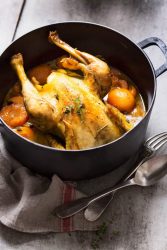 - Verser le cidre dans la cocotte, ajouter les herbes aromatiques et enfourner à couvert.