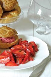Profiteroles aux fraises confites et sorbet fraise-thym citron