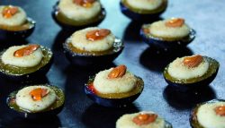 - Répartir le sucre cassonade dans une petite assiette et tamponner les fruits farcis dessus (cela apportera un peut de croquant à la bouchée).