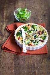 - Etaler la pâte brisée. Garnir la pâte de bouquets de brocoli. Ajouter les lardons fumés et les rondelles de chèvre. Verser l'appareil à quiche et enfourner pendant 30 à 35 min en surveillant la cuisson.
