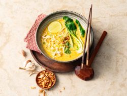 - Ajouter le bouillon et garnir de cébette et de coriandre ciselée, d’un quartier de citron vert et d’oignons frits.