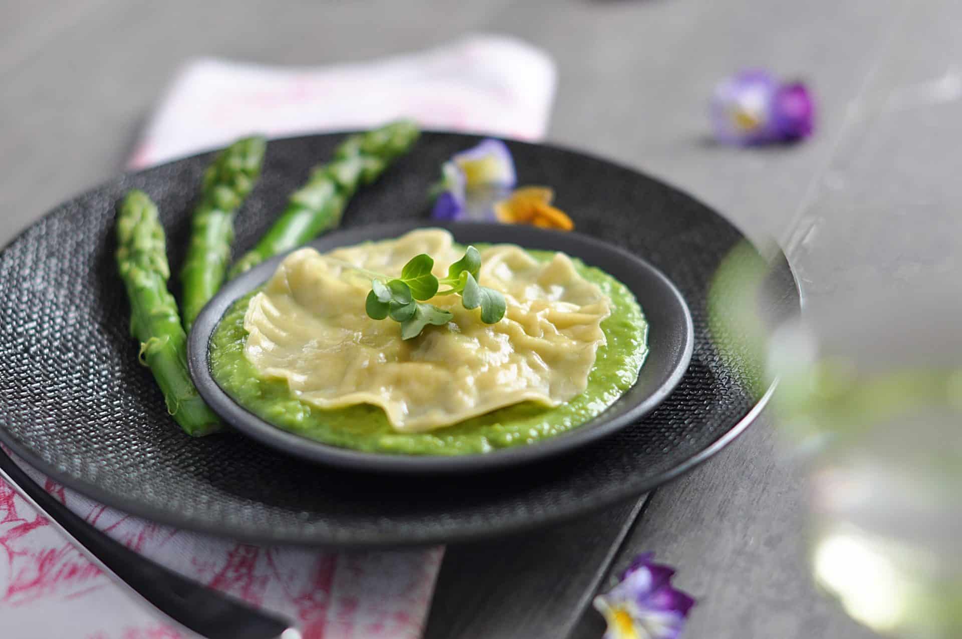 - Dressage : napper le fond des assiettes de crème de petits pois puis déposer les ravioles dessus. Ajouter des morceaux d’asperge verte puis décorer selon le goût de fleurs comestibles ou de pousses.