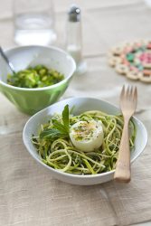 Rémoulade de courgettes à la menthe, œufs mollets et gremolata
