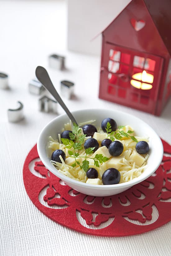 - Coupe le fromage en fines lamelles (ou en cubes, comme tu préfères) et dépose-les sur la salade puis mélange.
