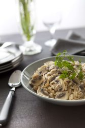 - Verser dans le riz le vin blanc et cuire jusqu'à ce que le vin soit totalement absorbé par le riz. Ajouter les champignons.
