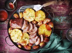 - Lavez les pommes de terre et placez-les dans un grand plat à four. Salez, poivrez, versez les 200 ml restants de jus d’ananas et mettez au four pour 15 minutes de cuisson.