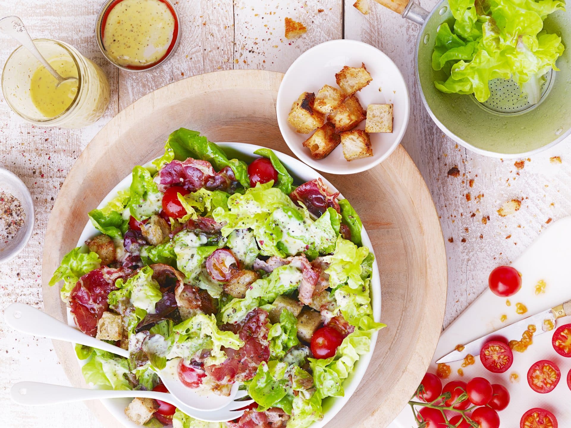 - Ajoutez les tomates cerises coupées en deux, les croûtons et les tranches de lard coupées grossièrement.