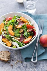 - Dans un saladier, déposer la roquette, le fenouil émincé, les quartiers d’abricot, et les noix concassées.