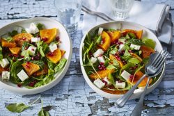 Déposer les tranches de courge sur une plaque de cuisson recouverte de papier sulfurisé, arroser d’un filet d’huile d’olive et enfourner pendant 20 minutes environ.