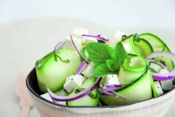 - Ajouter les courgettes taillées, la menthe et l'oignon rouge ciselés. Mélanger.