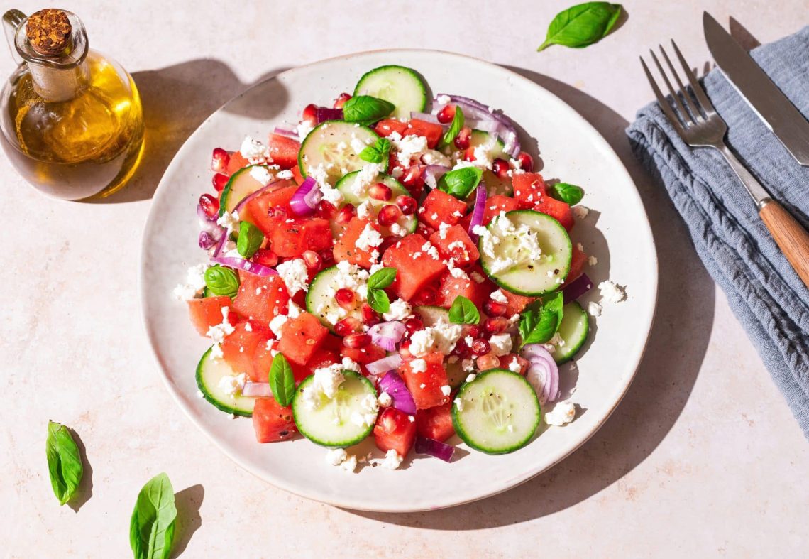 Disposez dessus harmonieusement les noisettes, les copeaux de parmesan, les grains de grenade, la feta et terminer par la menthe.