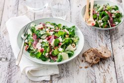 Salade de mâche au magret fumé, féta et grenade