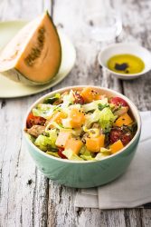 - Couper le melon en deux et retirer les graines à l'aide d'une cuillère. Le couper en tranches et retirer la peau en glissant la lame d'un couteau entre la peau et la chair. Tailler les tranches de melon en cubes.