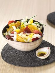 Le petit plus gourmand et festif : ajouter à cette salade de petits croûtons de pain d'épices (taillés en petits cubes et sautés au beurre dans une poêle antiadhésive). La parfumer de quelques zestes d'orange très fins.