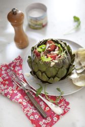 - Garnir le centre de chaque artichaut de salade au pesto. Déguster d’abord la salade, puis les feuilles d’artichaut et terminer par le fond (l’émincer ou le couper en petits dés). Rajouter, au besoin, selon le goût, un peu de vinaigrette pour terminer la dégustation de l’artichaut.