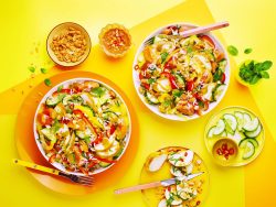 - Assemblez la salade : répartissez le riz dans deux bols. Ajoutez les légumes, les abricots et les lamelles de poulet. Nappez de sauce puis parsemez de menthe et de cacahuètes concassées.