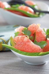 Salade pomelo-avocat, coriandre fraîche et crevettes roses