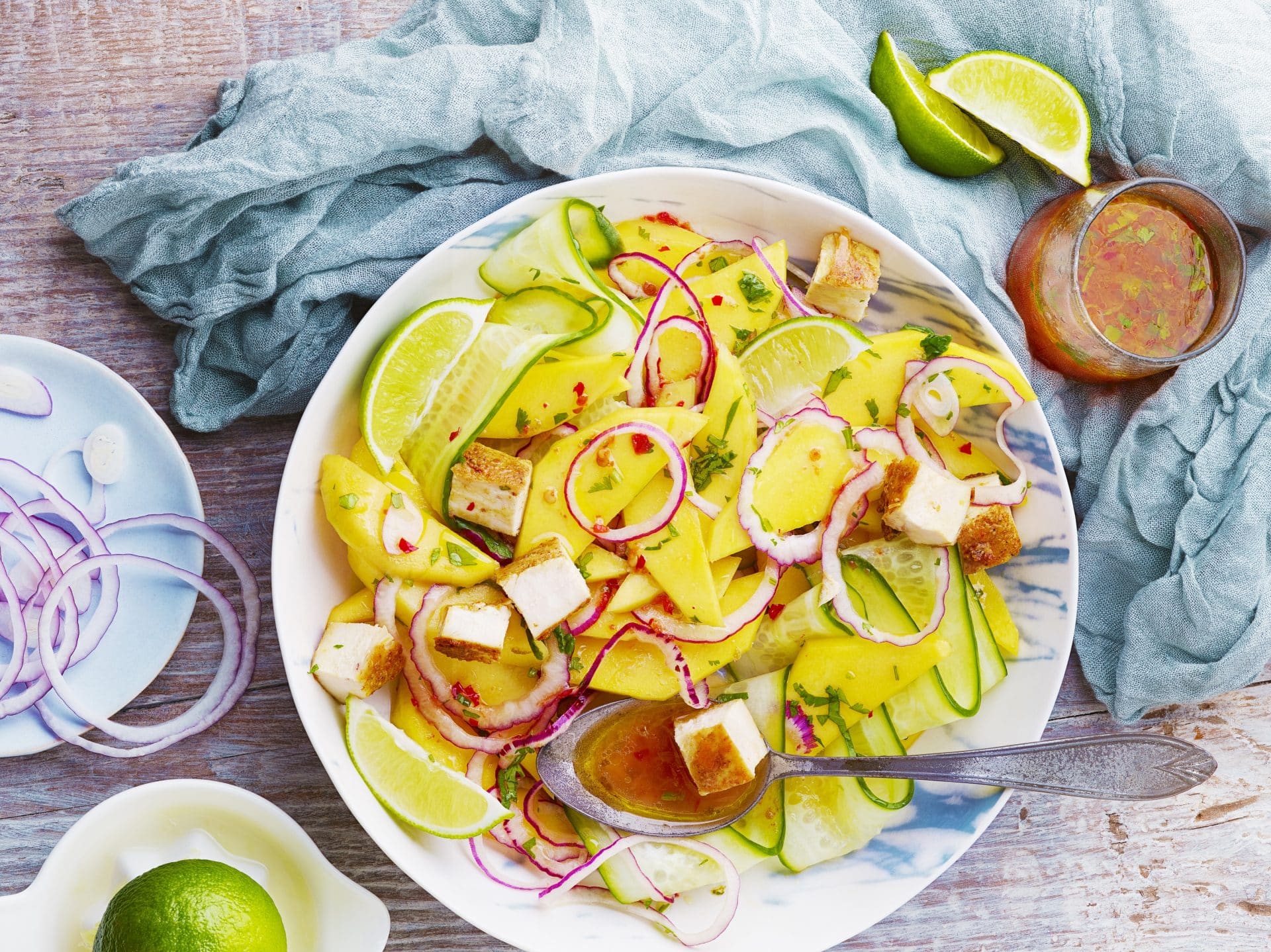 Mélangez le zeste râpé d’un des deux citrons verts et le jus des deux citrons avec le sucre, le piment, 1 c. à soupe d’huile, du sel et la coriandre hachée.