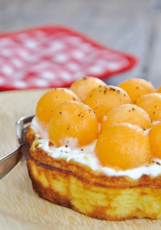 - Sur le côté cuit de chaque escalope de veau, déposer une tranche de jambon de Parme puis ajouter des tranches de mozzarella, des lamelles de melon et un peu de sauge ciselée.
