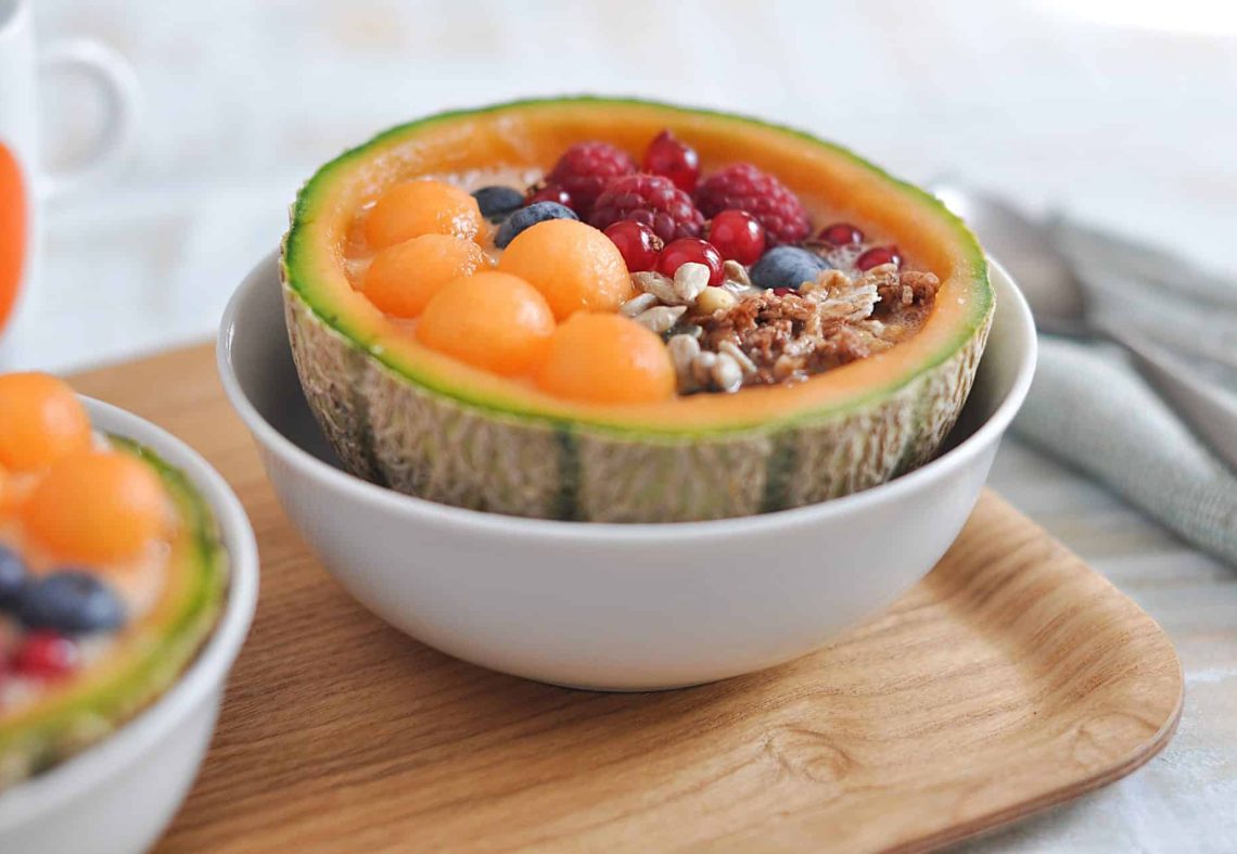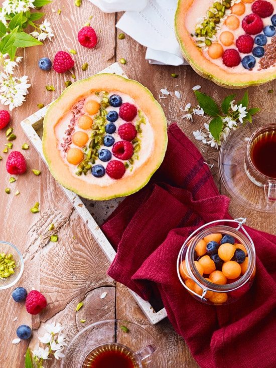 - Couper le melon en deux et retirer les graines à l'aide d'une cuillère. Le couper en tranches et retirer la peau en glissant la lame d'un couteau entre la peau et la chair. Tailler les tranches de melon en lamelles très fines.