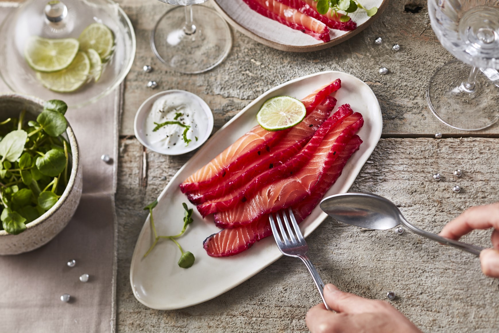 Saumon gravelax à la betterave, cresson, zestes de combava